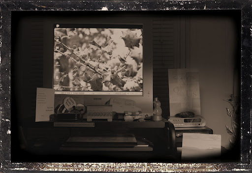 The picture really is of my desk, taken tonight, although I gave it the “old” feel by using software, imaging what a picture of my desk might look like in a hundred years. You can click on it for a larger version.