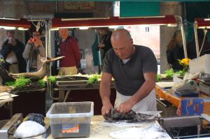 These pictures show the fish market in Venice. Now, we have fresh markets in Virginia and Vermont as well, but typically they are a one day a week affair, where we gather a few vegetables and perhaps some meat, to carry us for a week, while in Venice and other places they are daily markets, and each day people gather their food for the night ahead. There IS a difference and even this long time junk food junkie has to admit, the difference is a marvelous thing.