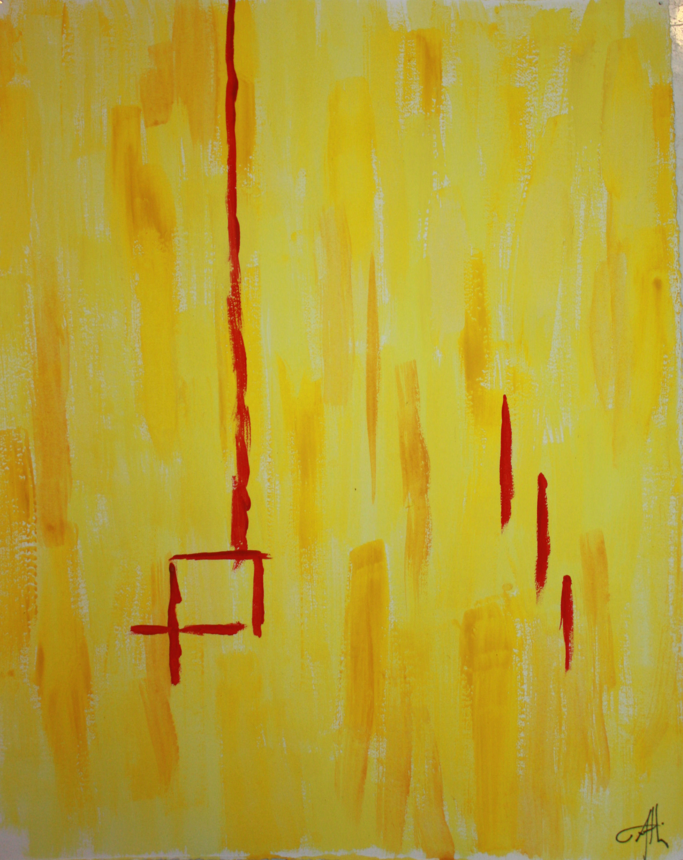 This is the first, and so far, one of my favorites in a series of “yellow” paintings inspired by an unknown artist in Woodstock, VT, Frank Loyd Wright, and Dante. It’s titled “Red Pendulum”.  It’s watercolor. 8″x10″. Not yet framed.