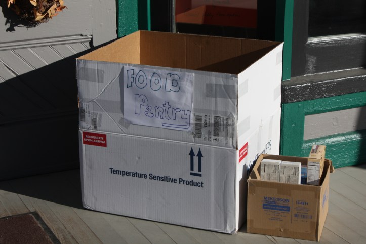 For instance, outside the door to town hall were boxes for the food pantry, and many of us had our hands full of boxes and cans to leave off. Above the Food Pantry boxes was a hand made sign from the Pawlet Library offering hot coffee and tea, as well as soups and other foods.