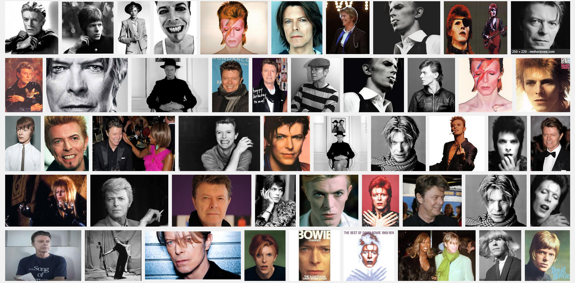 PS – The picture is a screen capture of what came up on Yahoo image search when I put in “David Bowie”. I can almost hear him sing as I look at the pictures.