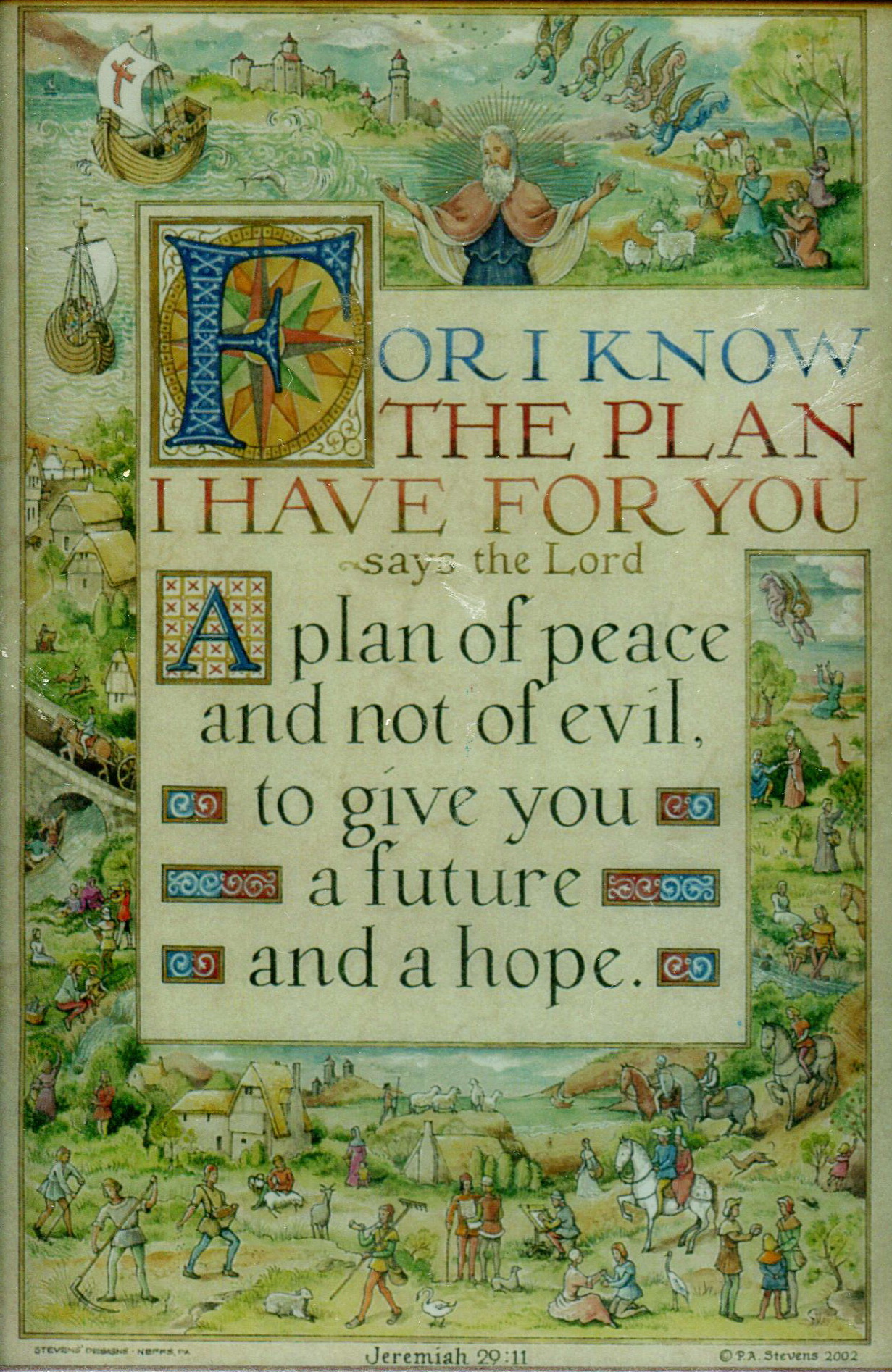 Jeremiah reads: “For I know the plan I have for you says the Lord. A plan of peace and not of evil to give you a future, and a hope.”
