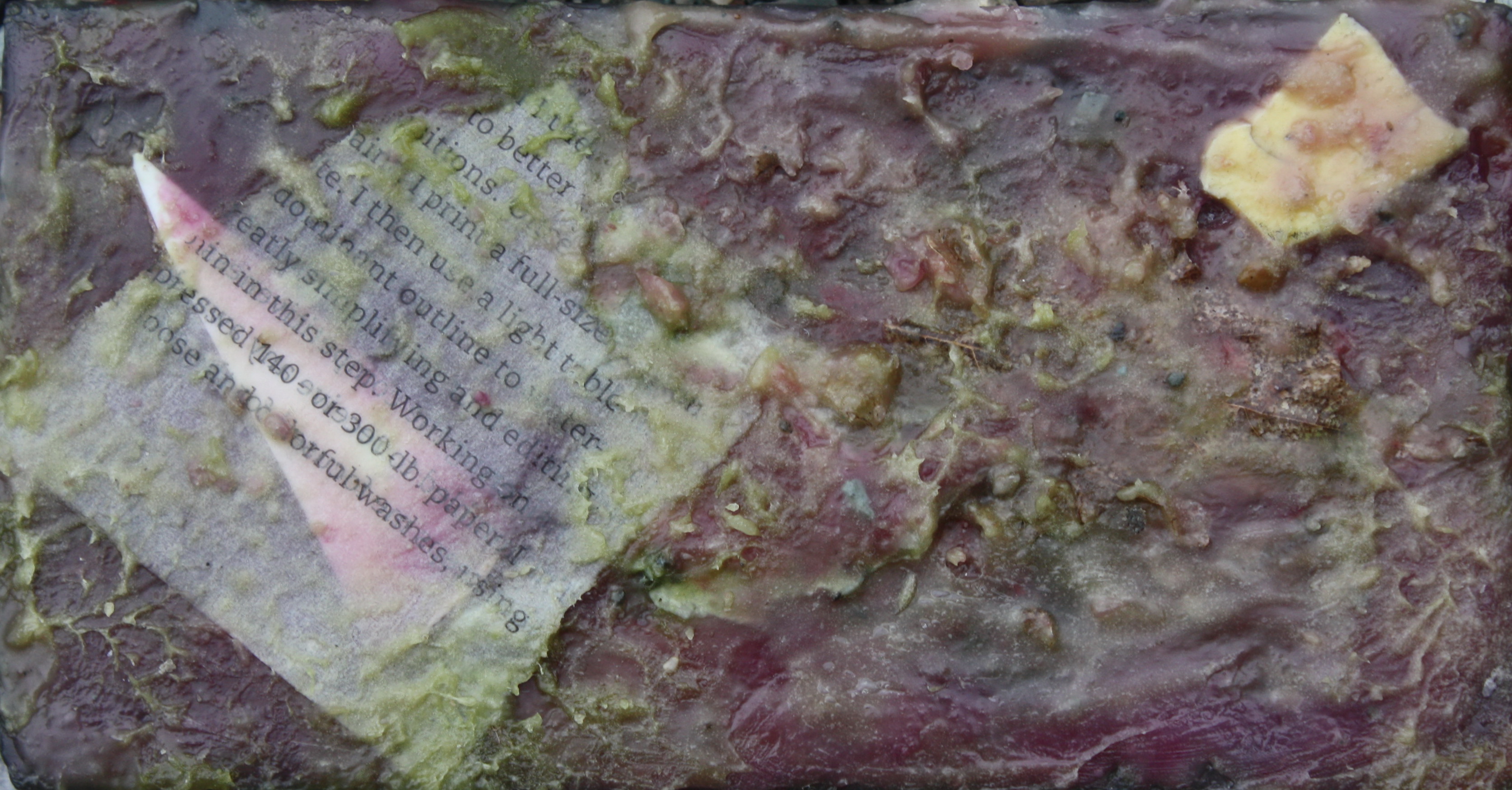 Encaustic art is built around melted wax and texture. My son has been doing it for years when he comes here to Vermont to visit. The picture is a piece he did in July that I particularly like, and always suspected had a poem buried in it somewhere.