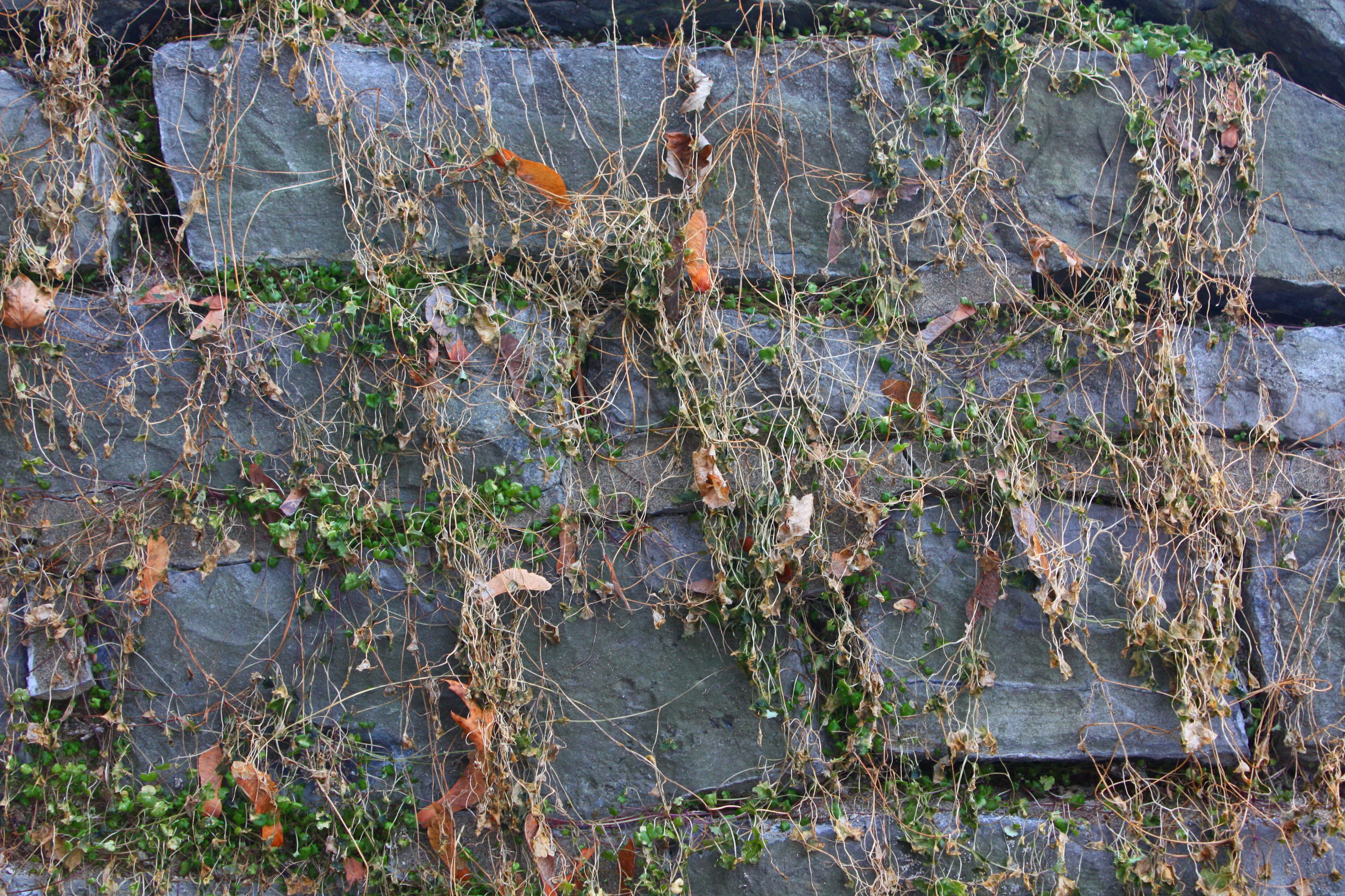 The vines slither down the stone wall.