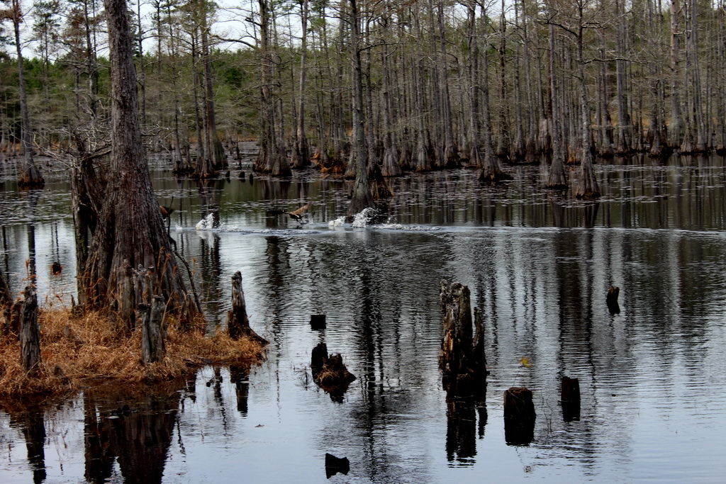 Sixteen acres of water. Black water, made black by hundreds of years of pine and cypress needles falling and rotting in the water. The water comes in from two small creeks, and oozes in from springs, and then at one end, runs out over a dam built in the fifties.