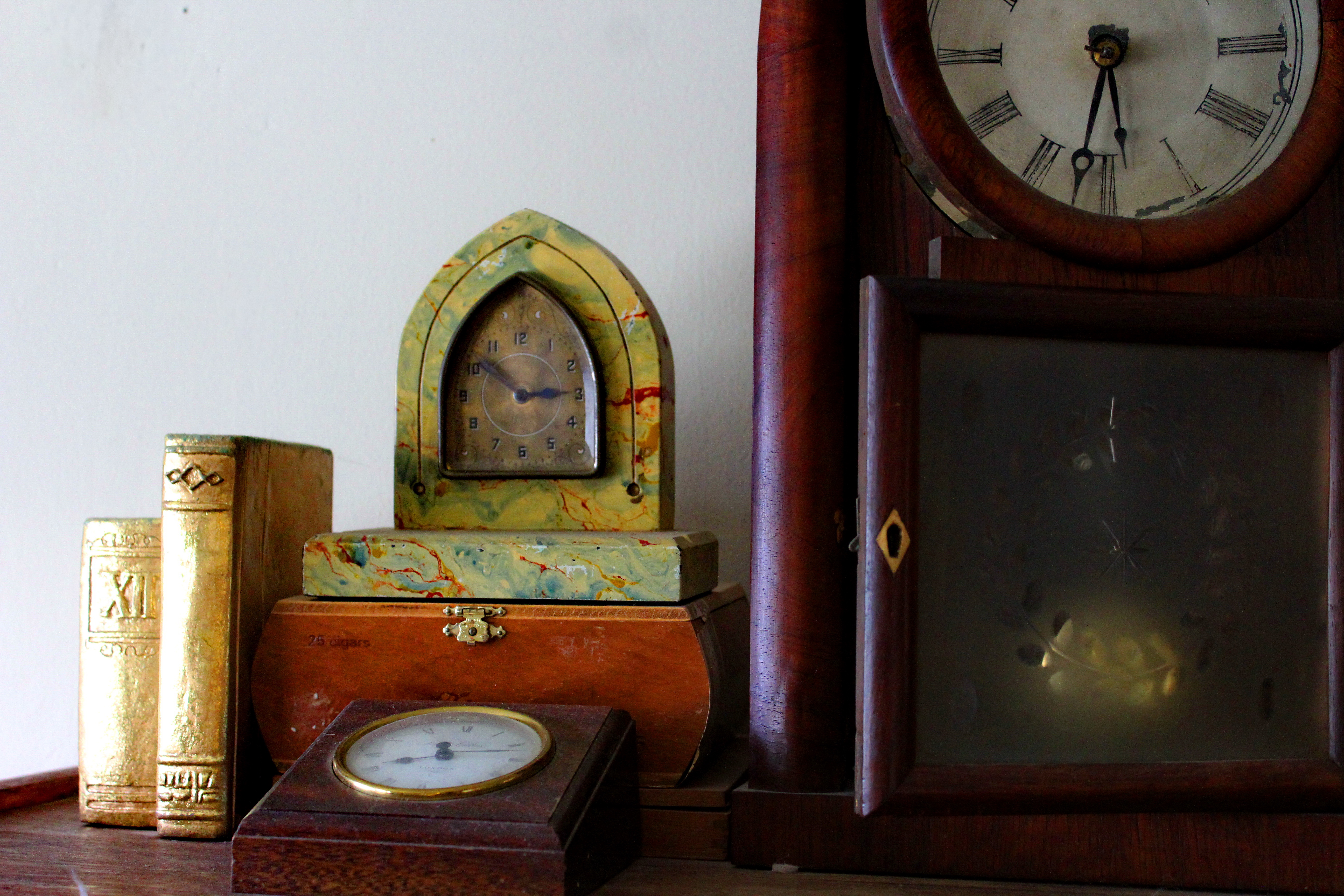 PS: The picture is from my office. The tall arched mantle clock was my great grandfathers. The small arched clock was my grandfather’s. The square, angled clock from England was my parent’s.