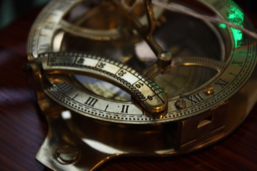 It is a strange thing, brass, half compass, half sextant.
