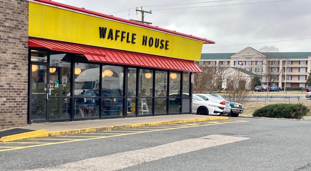 This particular waffle house is in Fredericksburg, Va. It is across from the hotel where I stayed when visiting my daughter while she was in college. I would often come here before meeting her on weekends. It’s been years. One of the waitresses, and older woman missing a few teeth with the biggest smile, greeted me and got me coffee.