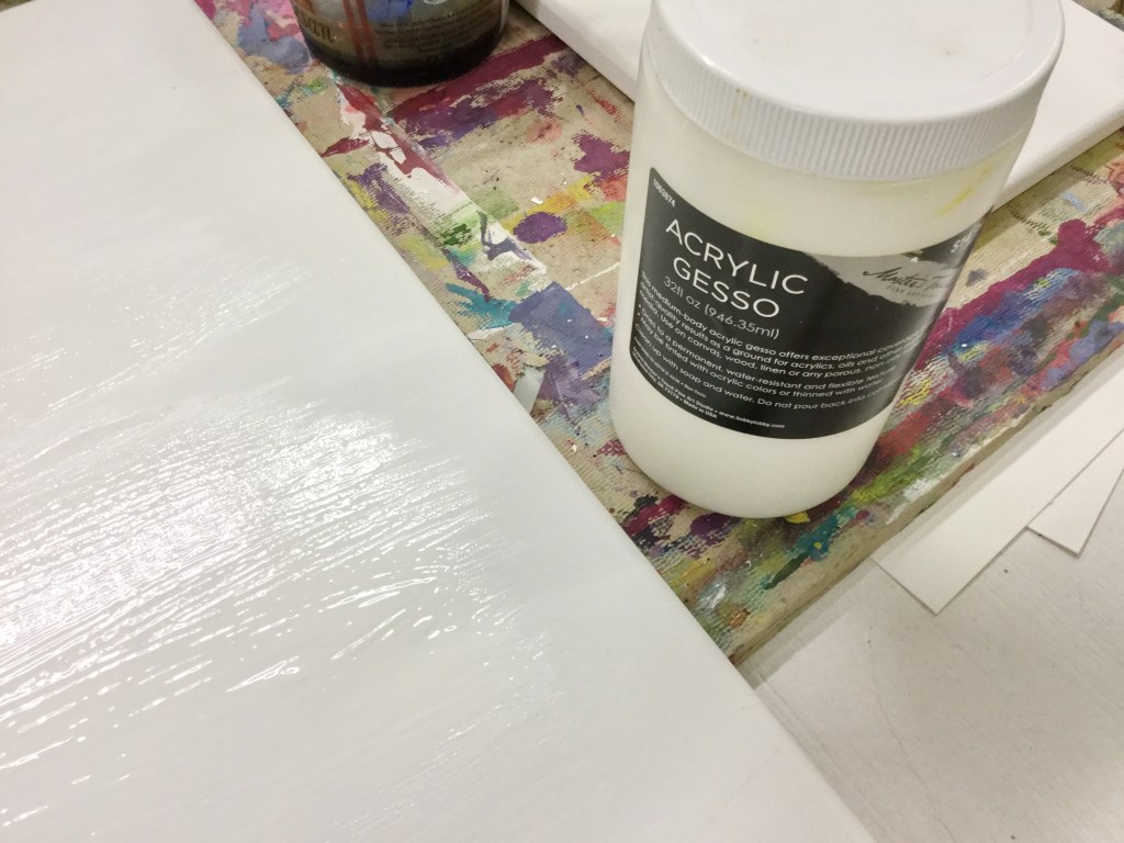 For non-artist, gesso is this thick white stuff you paint on raw canvas, or a botched painting, to prepare it for a new painting. The picture is from my studio.