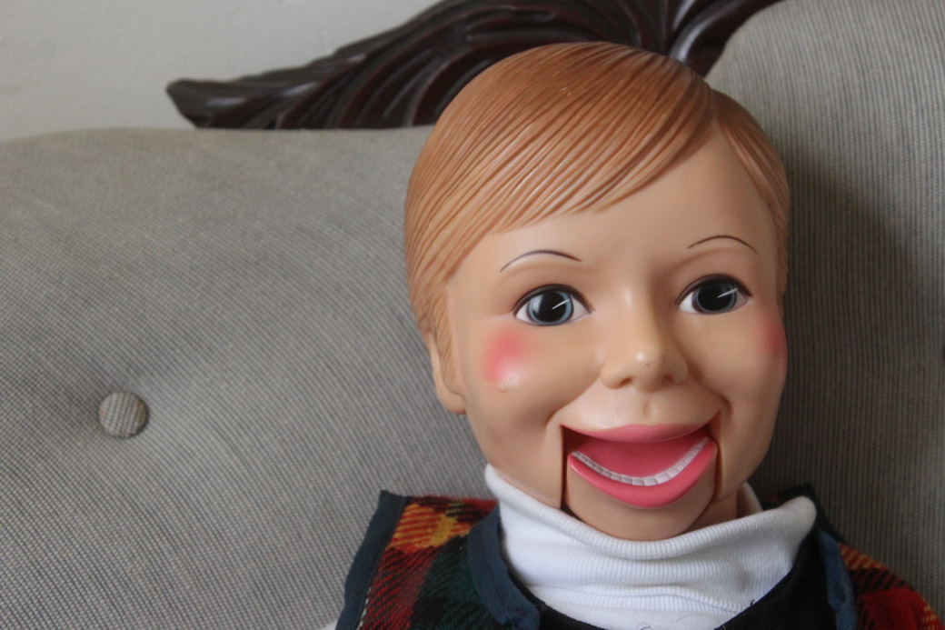 The Ventriloquist’s dummy sits placidly on the antique settee.
