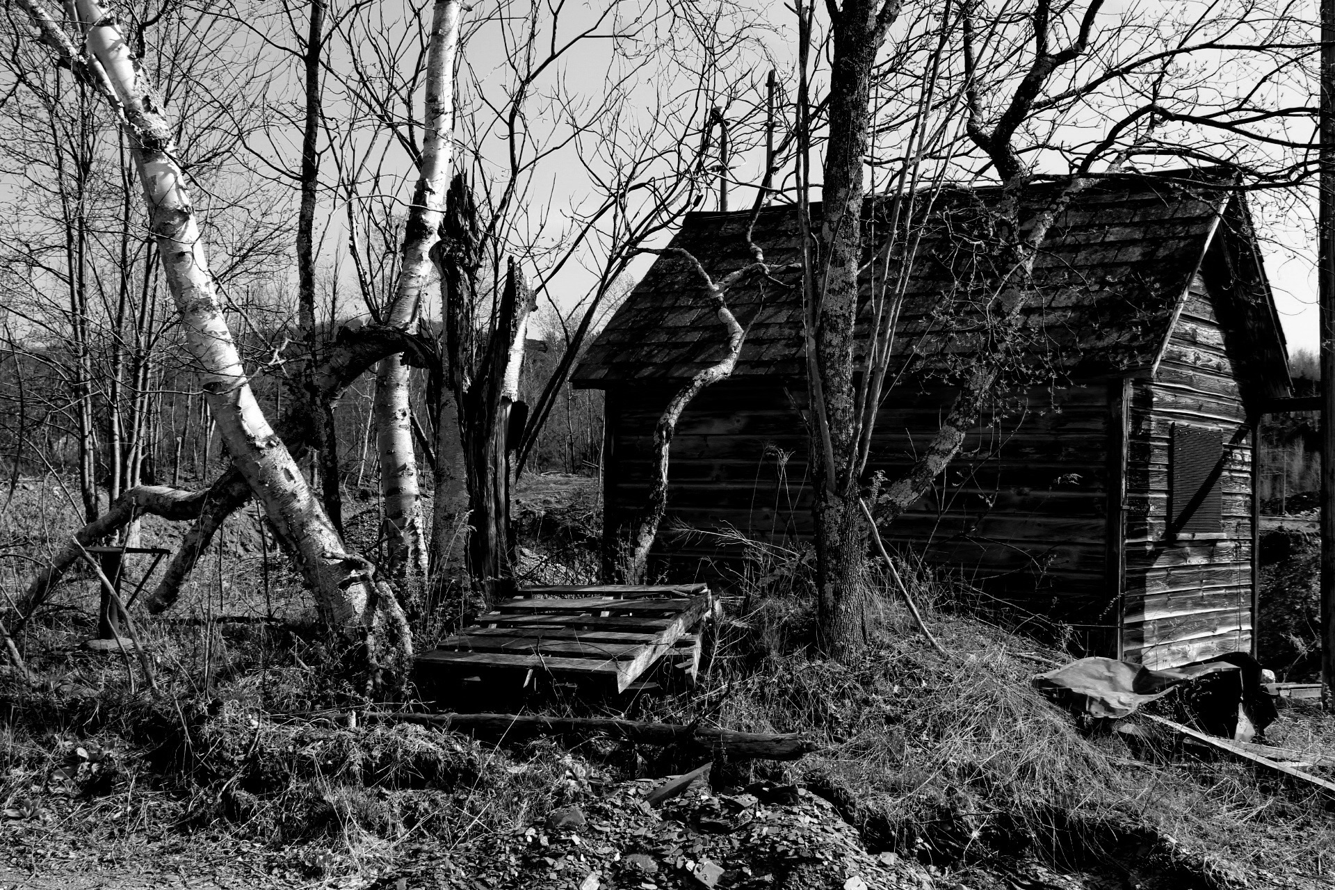 The picture was taken this weekend, during a walk through a nearby quarry that was long abandoned, but has been reopened. The cabin, probably a foreman’s off from a time long ago, is not on the edge of where they are carving out slate. It won’t be there much longer, I suspect.