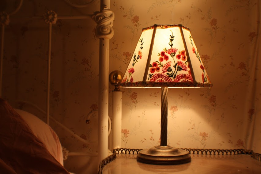 The picture really is of my bedside, about 12 years ago. I really did make the lampshade.