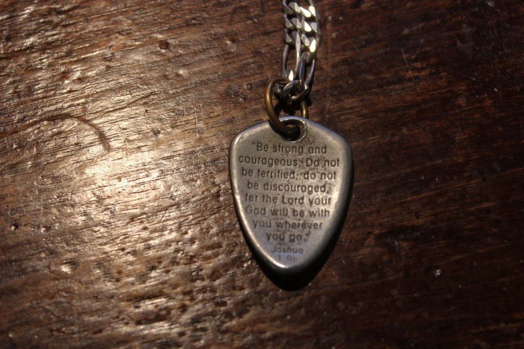 I was looking for something else this morning when I came on this picture. It it the flip side of a cross I wear every day. You can see it is a shield and on the flip side, there is a cross, simple, reminincent of a Templar’s cross, and on the side in the picture, this verse, Joshua 1:9.