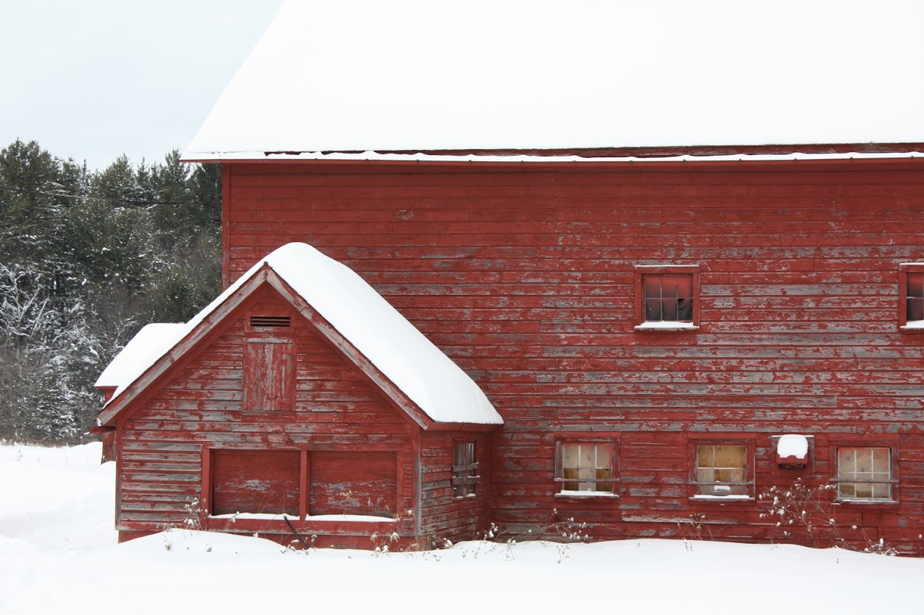 Red barns and dark abandoned ones stand out.