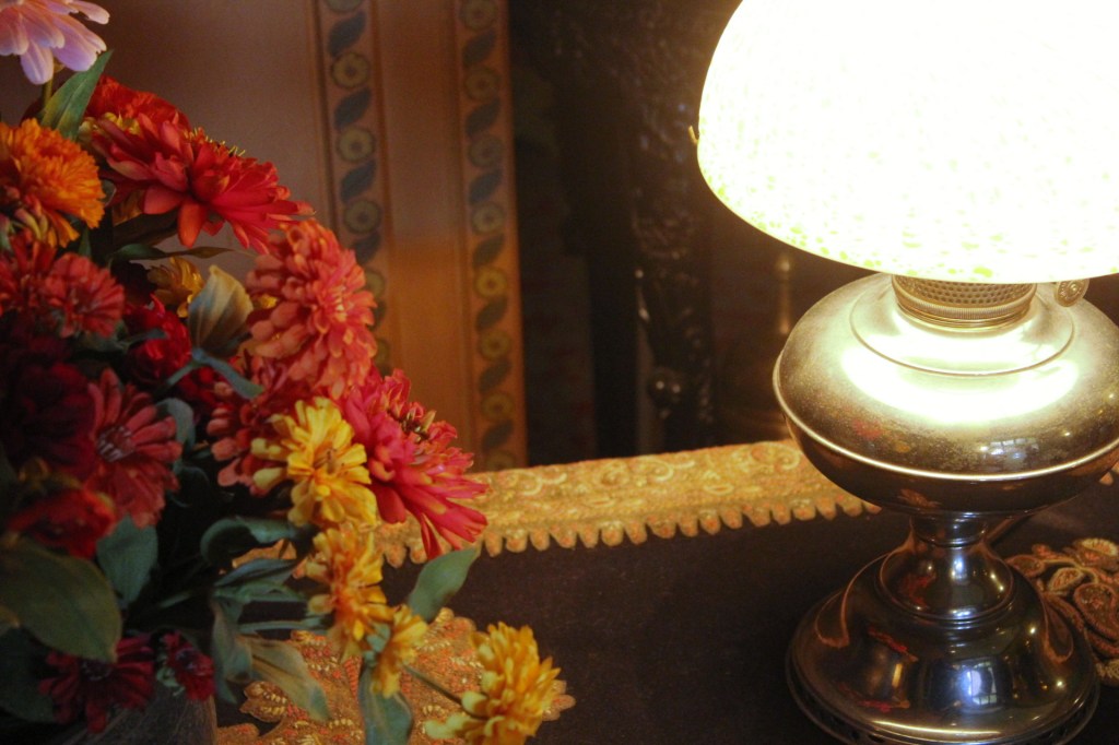 A brass light, bright in the dusk.